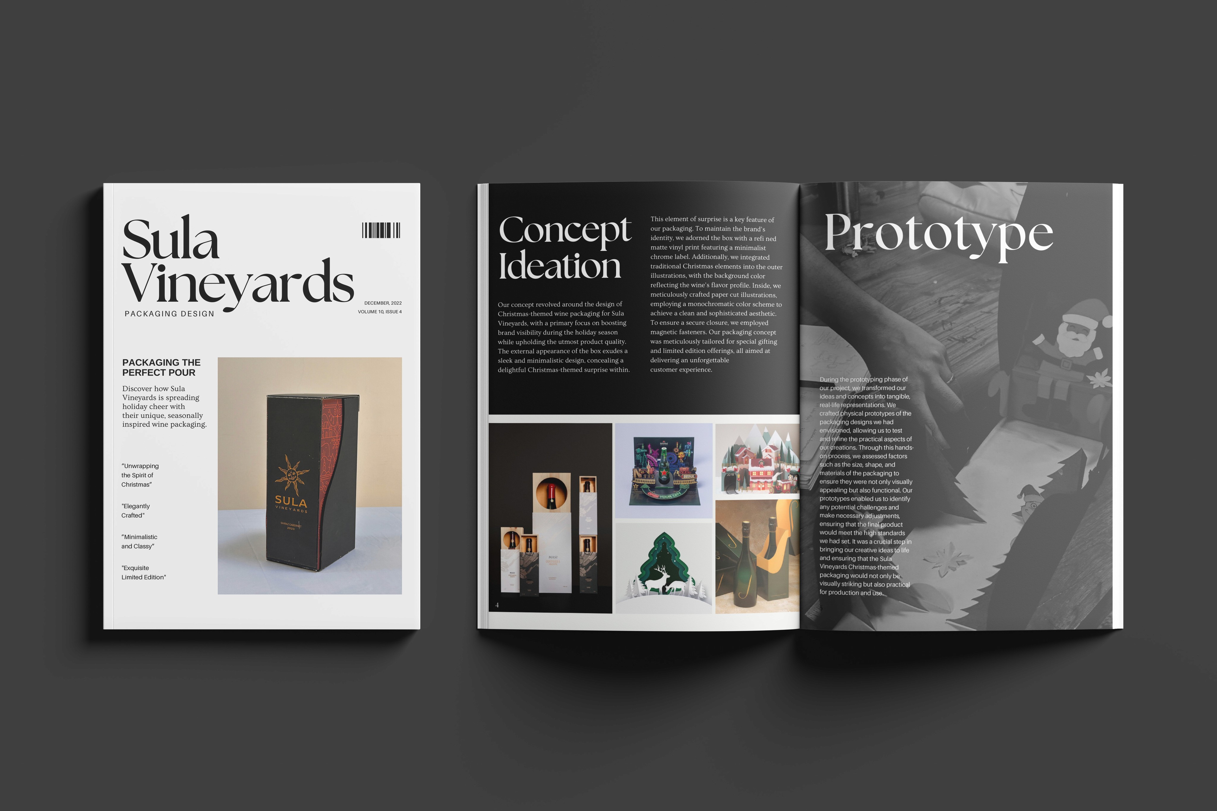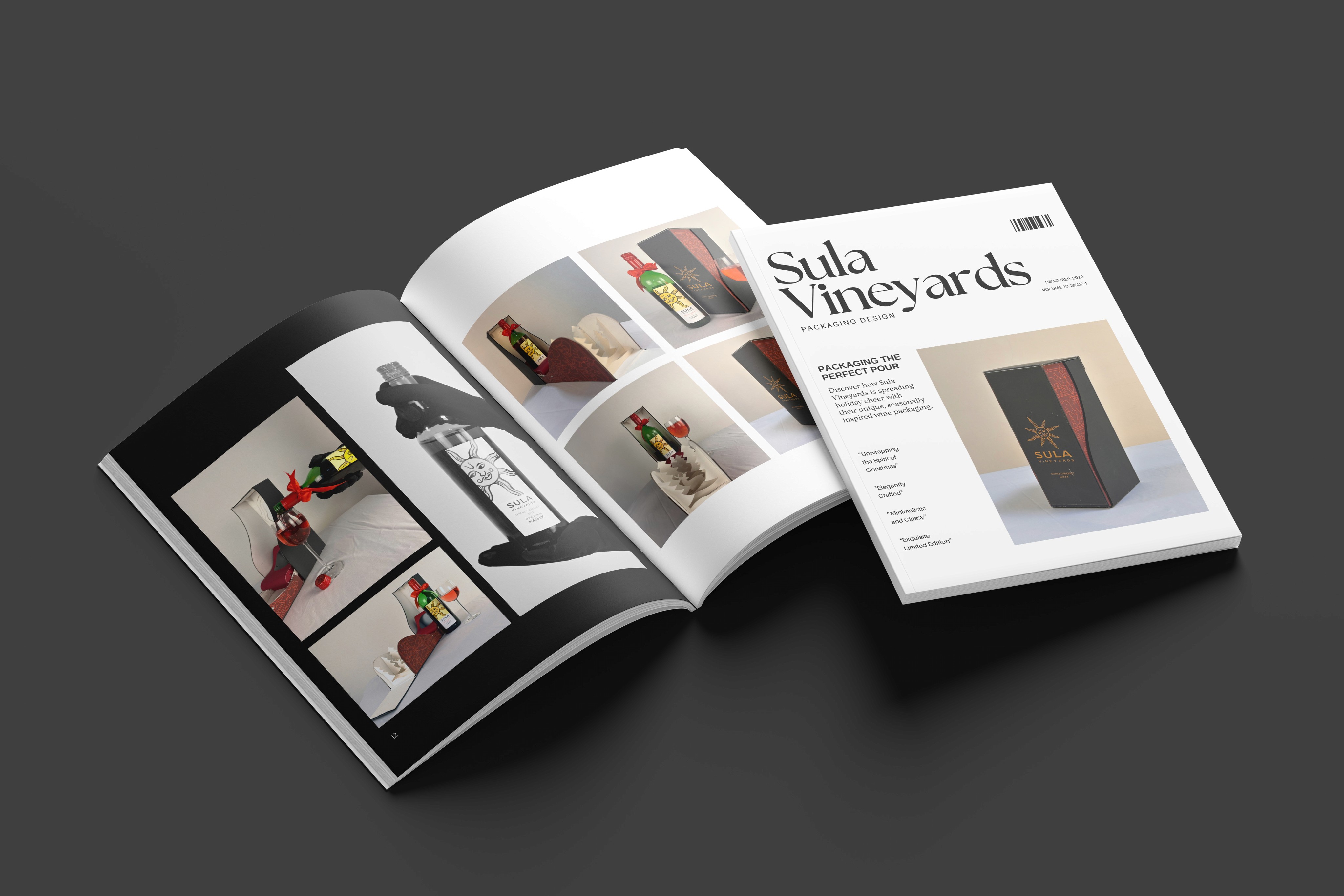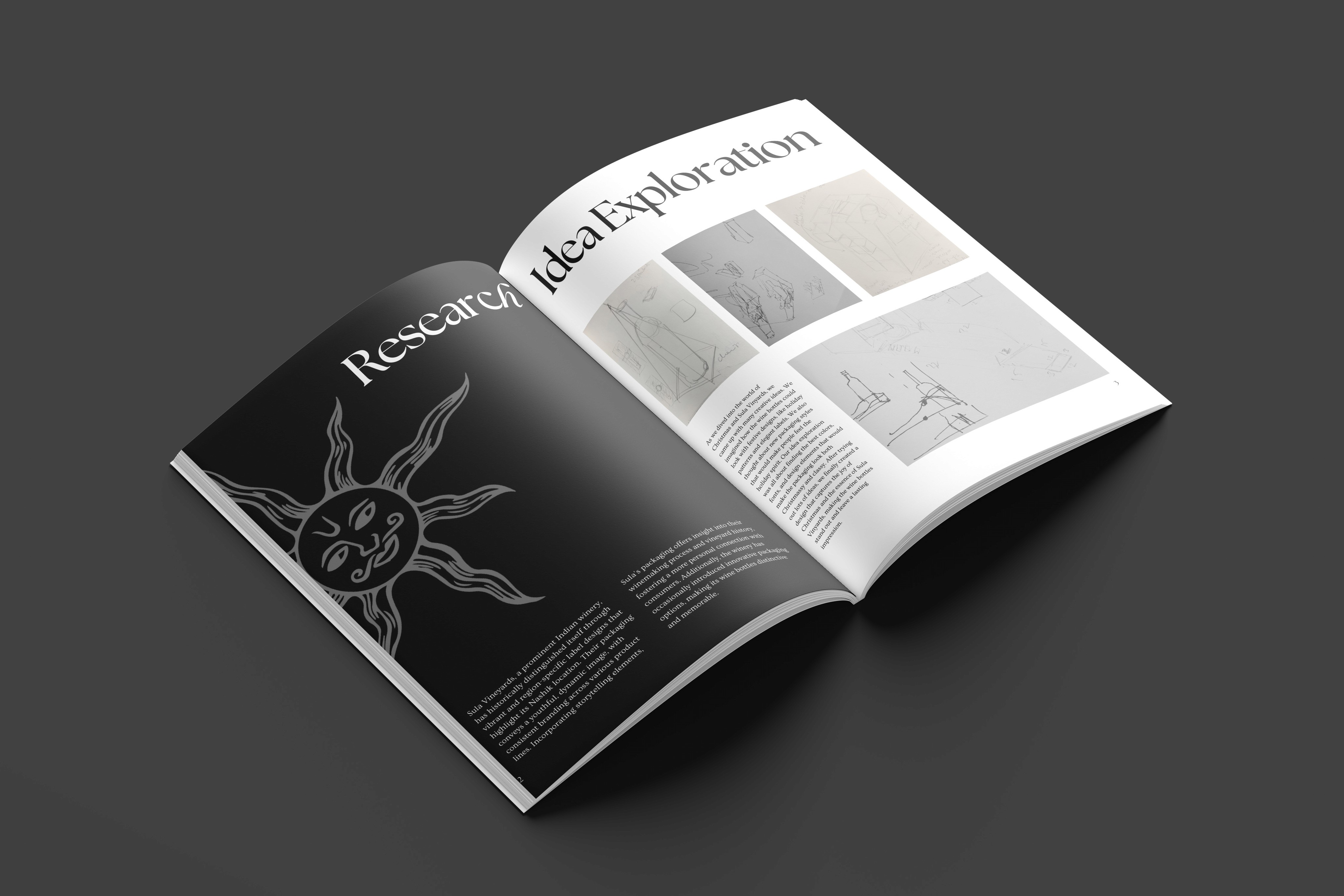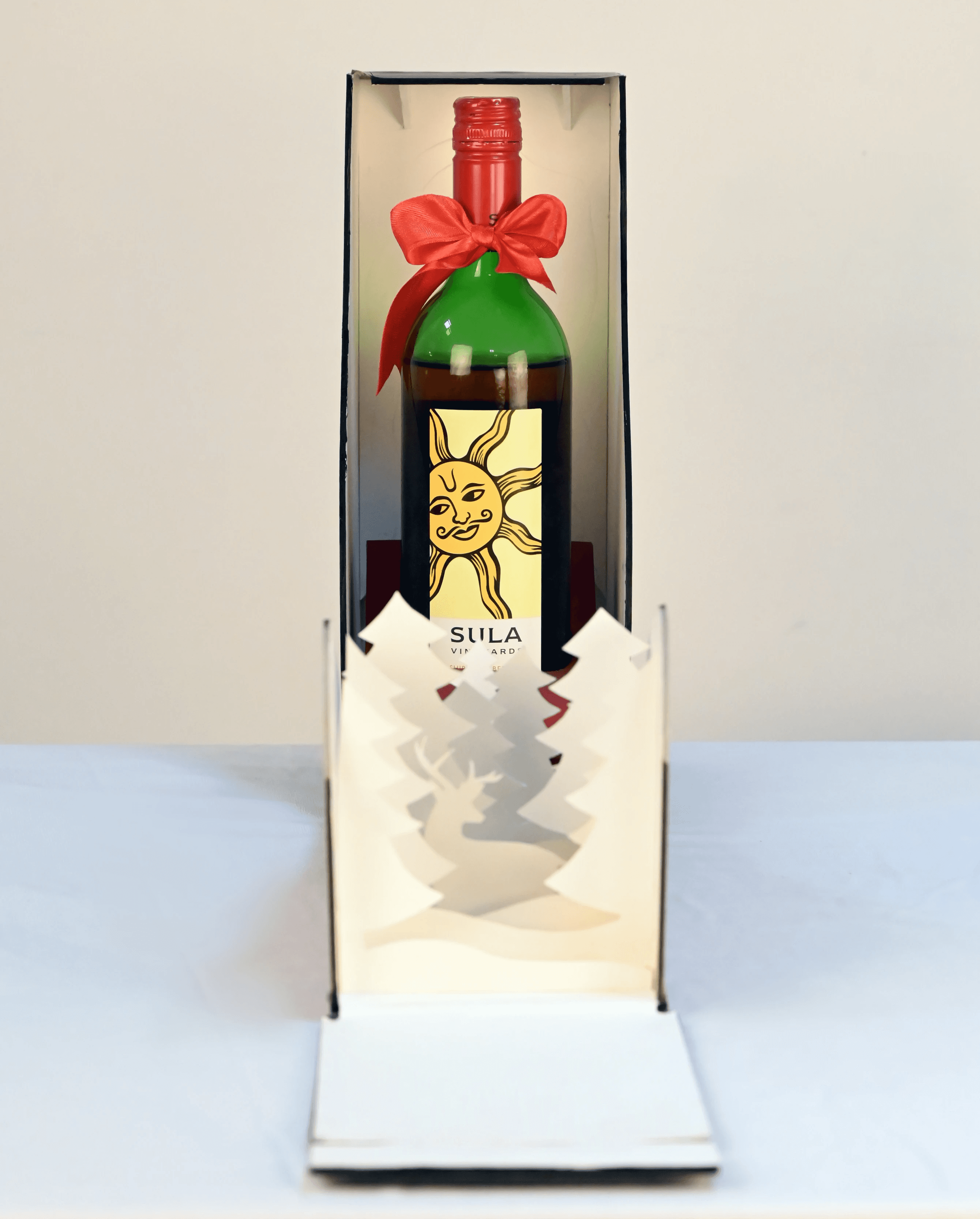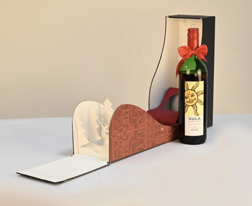 Our concept centered on designing Christmas-themed wine packaging for Sula Vineyards, aiming to enhance brand visibility during the holiday season while maintaining product quality. The external box features a sleek, minimalist design with a refined matte vinyl print and a surprise element inside. The Christmas illustrations blend with the wine's flavor profile, and the inside is showcased through carefully crafted paper cuts. The box is secured with magnetic fasteners, creating an elegant and sophisticated closure. This packaging, tailored for special gifting and limited editions, ensures a memorable customer experience.